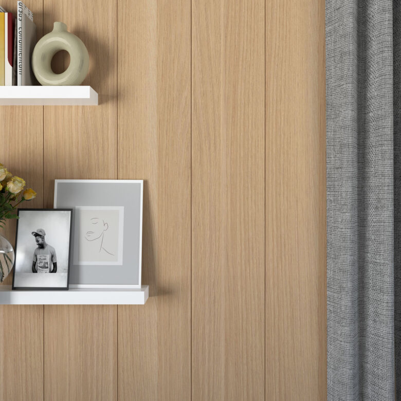 Dekoracyjna okleina z jasnego dębu z subtelną siatką i synchronicznym wykończeniem. Są to listwy o szerokości 325 mm, które są połączone ze sobą za pomocą pióra i wpustu, pozostawiając niewielkie wgłębienie, które nadaje pomieszczeniu odrobinę designu i elegancji.