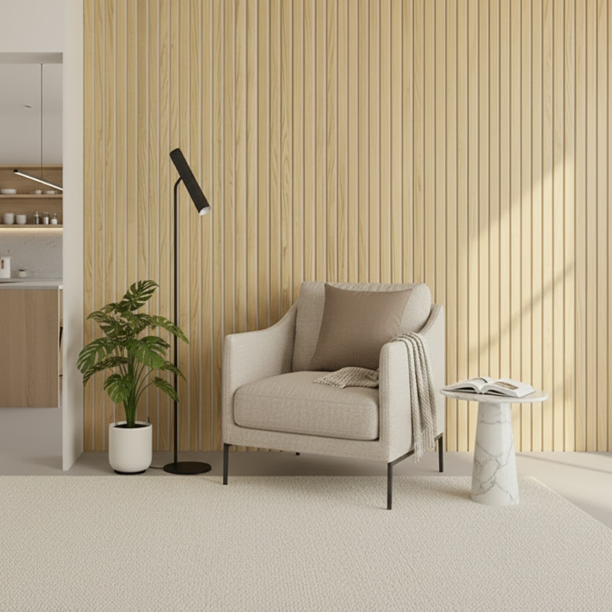 Revestimiento decorativo de interior bicolor con acabado en color roble claro y fondo blanco en relieve con cinco listones para pared o techo. Las lamas van unidas con machihembrado creando un efecto alistonado y moderno.