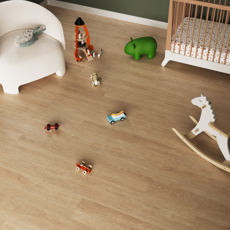 Nuestro suelo laminado cuenta con un bisel en forma de 4V a los 4 lados de la tablilla, brindándole un aspecto realista y auténtico que simula las tablas de madera genuina. Este acabado mejora la apariencia estética, añadiendo profundidad y realismo al patrón general del suelo.